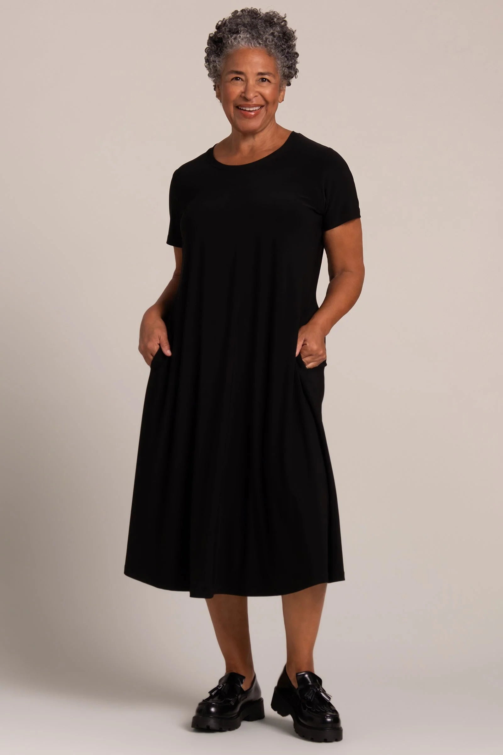 A spring-summer essential, this piece features short sleeves and a flattering fit-and-flare silhouette, complete with practical inseam pockets for added convenience.