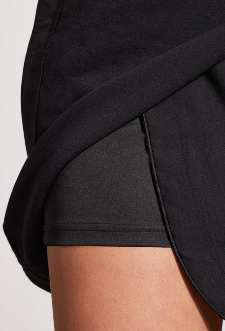 This pull-on skort, is a must-have staple that comes together with a faux wrap design, built-in shorts, functional pockets in the front and back, decorative cord piping, 18" length, and stretch twill fabric that adds extra flexibility.