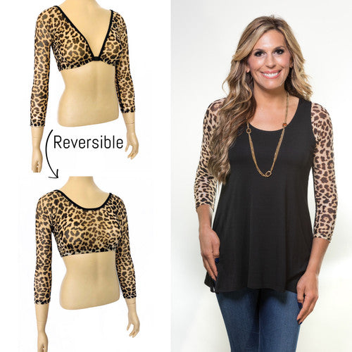 Transform your sleeveless tops and dresses with our Ultra Chic, arm cover up sleeves in 4- way stretch Leopard Mesh! Show off this trendy style of leopard mesh sleeves by wearing either the scoop or v-neck in the front or back! - the perfect arm wear for sleeveless dresses and tops! Looks great with blacks, browns, pumpkin shades, copper, cinnamon, ivories, and golds! Light-weight semi-sheer mesh for year-round arm coverage that won’t make you too hot! Comfortable "arm candy" that extends your wardrobe with mix and match versatility AND style! Shown here - Leopard mesh Sleevey is worn under Sleevey Wonders Turnaround Top in black modal jersey.