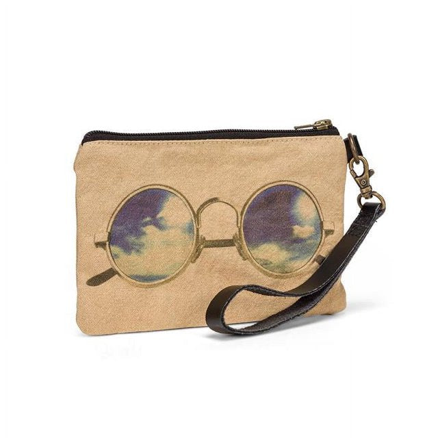Ensure the safety of your preferred eyeglass frames while on the move with this fashionable Eyeglasses Zip Pouch accompanied by a strap. Constructed from cotton and equipped with a durable leather strap, the pouch showcases an image of the iconic glasses associated with Mr. "Give Peace a Chance," set against a backdrop of cloudy blue skies reflected in the lenses.