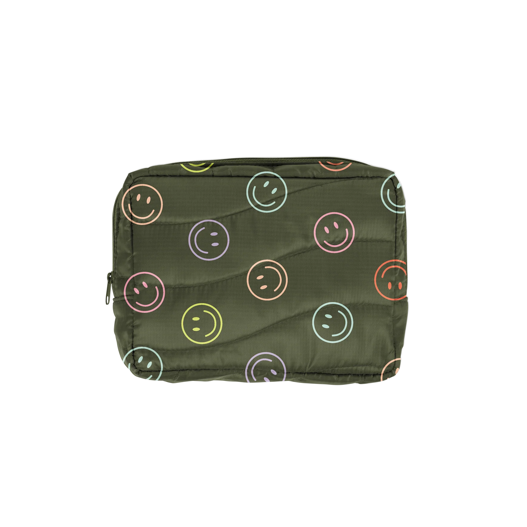 Pack a dose of positivity in our green cosmetic bag, decked out in smiley faces for those feel-good vibes. Because your makeup routine should be as happy as you are!
