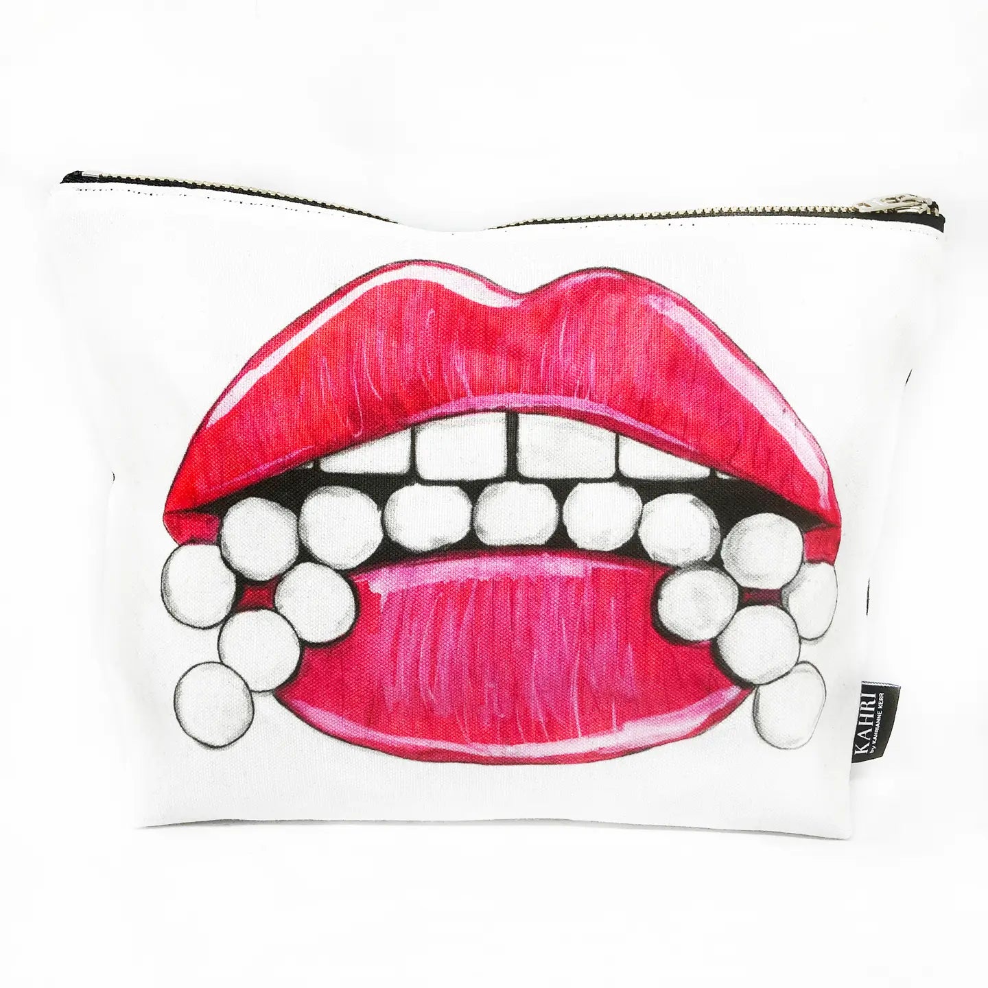 Cotton/Linen Canvas Pouch with digitally printed artwork on front and solid black linen back. Nickel metal zipper closure. Black linen lining. 6.25" H x 9.25" W x 2.75" D