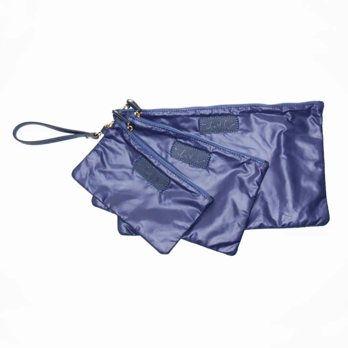 Triple the fun! This trio nylon patent everything pouch set is perfect for anything you can think of! On the go or daily use. Love the look? Wear one as a wristlet, as this trio comes with attachable strap included!dimensions: LARGE 9L x 15W MEDIUM 7L x 11W AND SMALL 5L x 9W