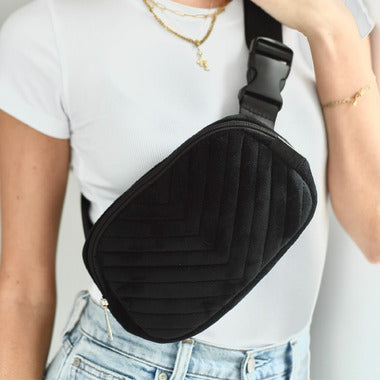 Elevate your look with this all-time favourite Velvet Fanny Pack. Use this fanny pack for your everyday essentials. Includes one exterior zippered pocket and three interior mesh pockets for extra storage. Lightweight and fashionable for anywhere on the go!