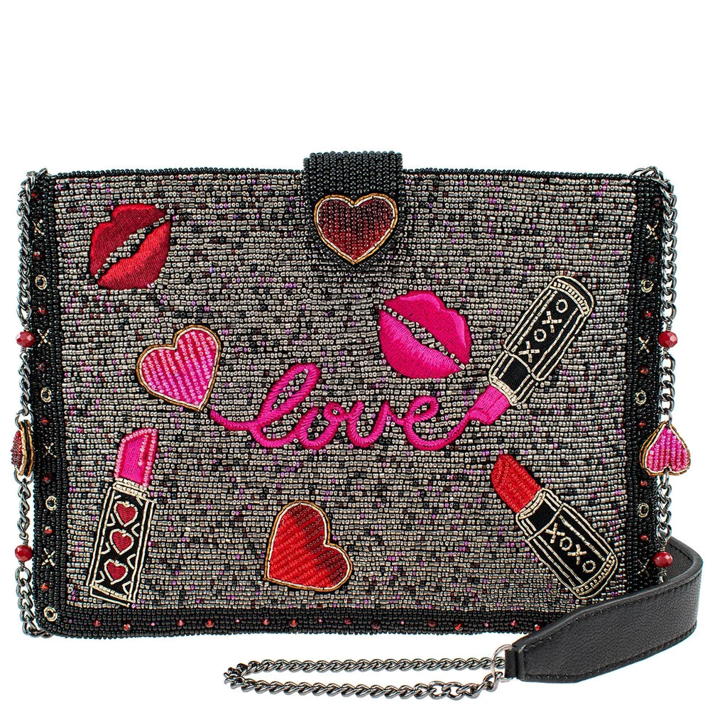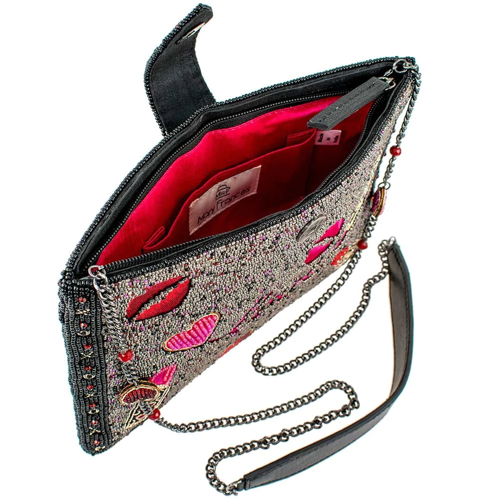 They say don't kiss and tell, but you won't be able to keep it to yourself with this dazzling crossbody handbag. With lively hand-laid beads of pink, red, gold, and silver colors, this bag is sure to catch some attention.