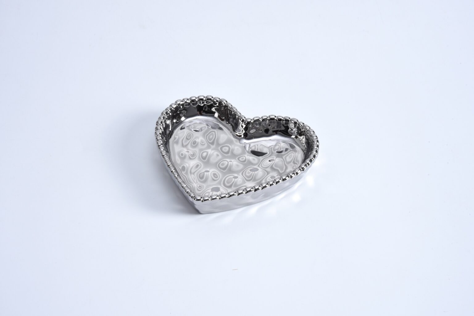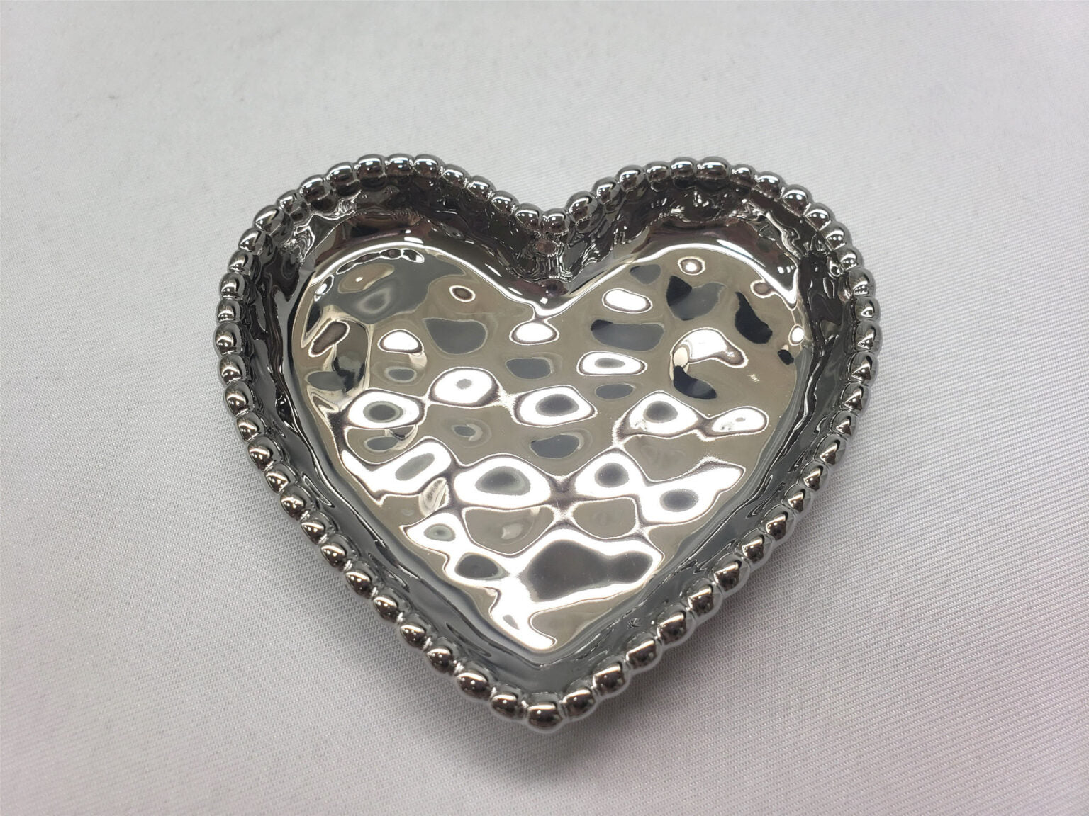 Silver Mini Heart Dish in Love is in the Air. Perfect all year round! This heart dish’s petite size will look gorgeous on a vanity or just about anywhere. A great Valentine’s Day, Mother’s Day or birthday gift! Show someone you “heart” them with this delightful dish. Crafted in stunning silver titanium finish with lustrous beads. Food safe, dishwasher safe, oven safe to 500°. Easy Care.
