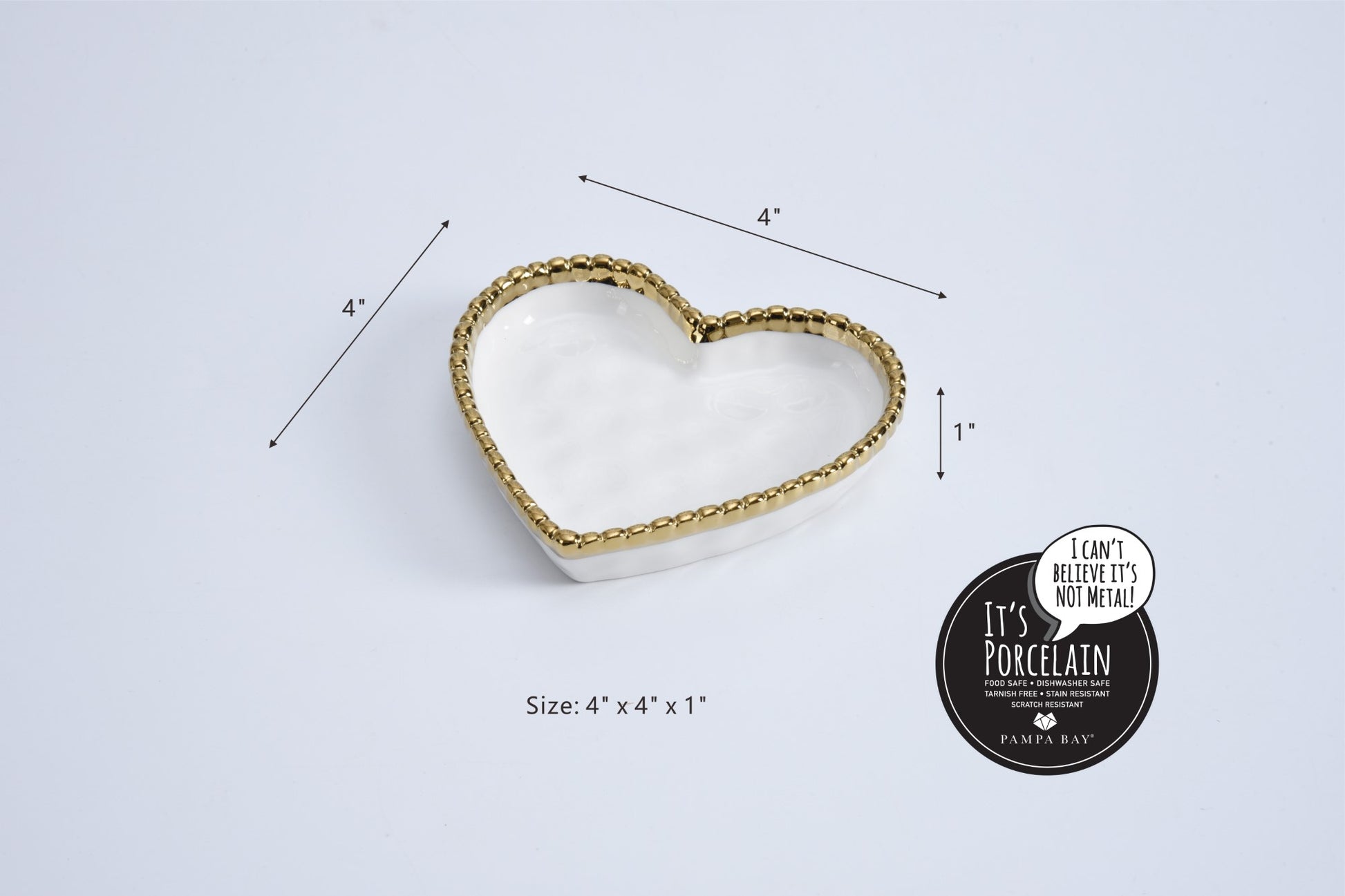 White Gold Mini Heart Dish in Love is in the Air. Perfect all year round! The Heart Dish’s petite size will look gorgeous on a vanity or just about anywhere. A great Valentine’s Day, Mother’s Day or birthday gift! Show someone you “heart” them with this delightful dish. Crafted in stunning white porcelain with lustrous gold beads. Food safe, dishwasher safe, oven safe to 500°. Easy Care.