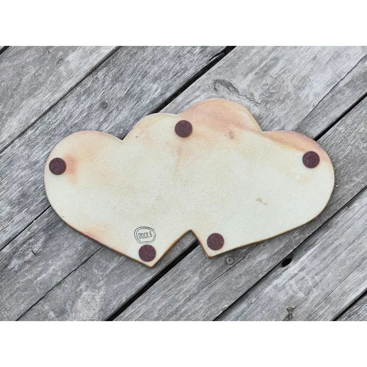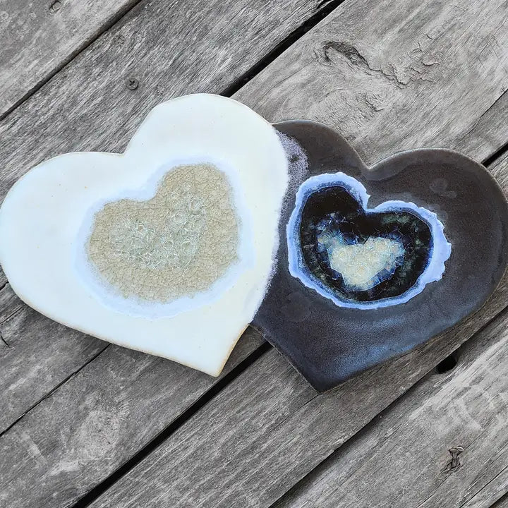 Add a touch of handmade elegance to your table with this functional Double Heart Shaped Trivet, crafted from stoneware ceramic clay and featuring our signature Geode-style crackle fused glass. Each piece is handmade in Minneapolis, Minnesota, making it truly one of a kind. Perfect for both decorating and protecting your surfaces, this trivet measures approximately 12"x8" and is shown in Black & White.