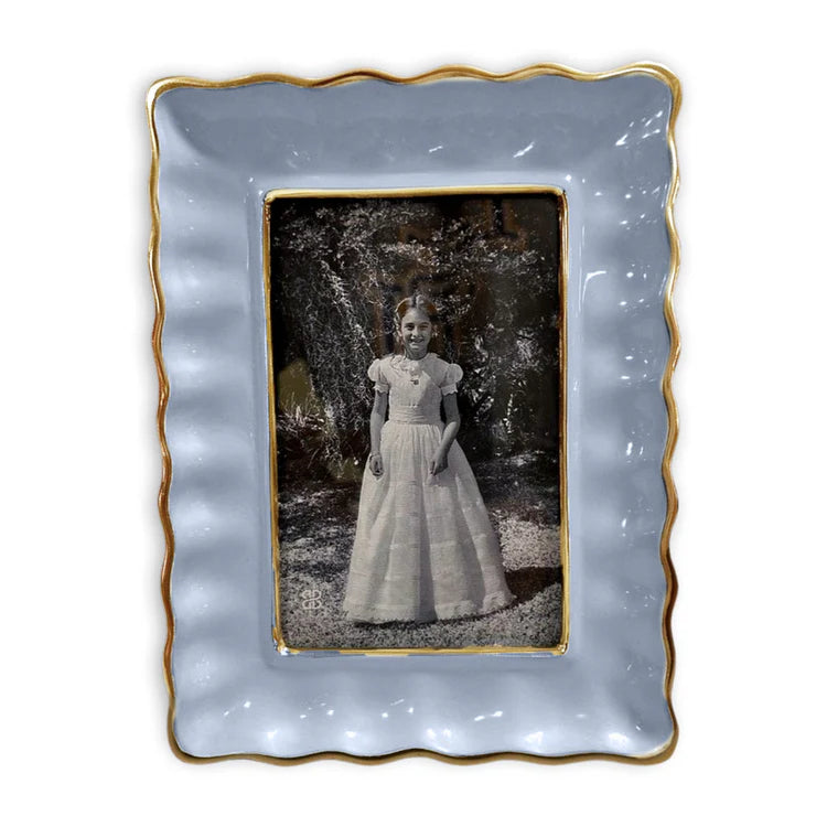 Beatriz Ball's FRAME Encanto Devon 4 x 6 (Periwinkle) is positively alive with scalloped texture and form, strikingly presented in colorfully enameled metal rimmed in gold. With an enchantingly tailored shape, the frame is ideal for displaying your favorite 4x6 photo in ENCANTO Devon style. Of heirloom quality, this frame may be displayed vertically or horizontally, and makes a perfect gift for any occassion. This handsome enameled frame will add a distinctive decorative touch to any room and will be cherished for years to come.