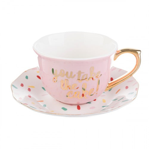 Whether the tea cup ends up with tea or whiskey inside, this tea cup and saucer set is ready to celebrate birthdays with it's "you take the cup" messaging in gold foil. The light pink tea cup with gold handle rests on a bright confetti covered saucer with gold foil accents. Hand wash only. Do not microwave.