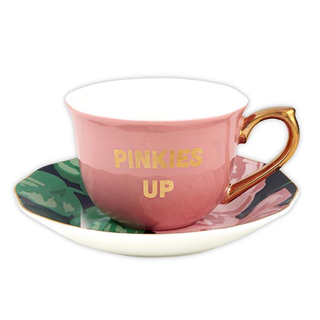 - READS "Pinkies Up"; gold lettering on pink, white saucer with pink flower design