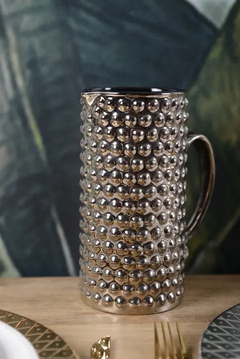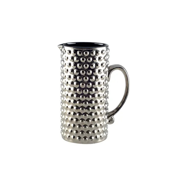 Serve in style with this silver beaded pitcher, featuring a sleek black interior. Perfect for adding a chic touch to your water service, it's both functional and fashionable.