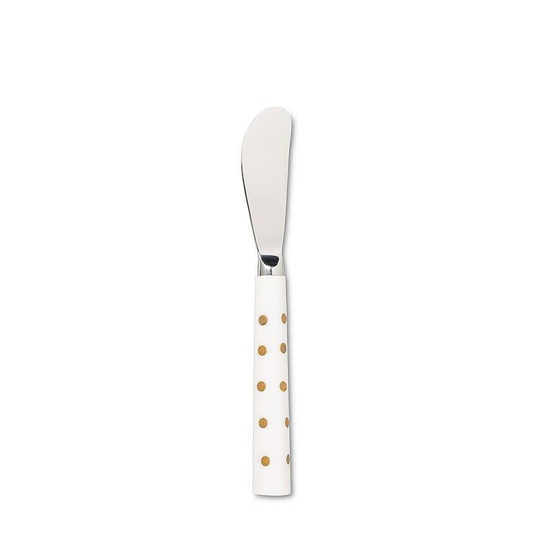 The combination of resin and stainless steel creates a harmonious blend of style and durability. The sleek silver spreader is beautifully contrasted by a white handle embellished with captivating gold dots, making it a striking addition to your table.