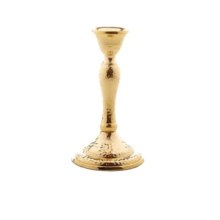 This luxurious, contemporary-styled candlestick adds a distinctive touch to your room's ambiance. Featuring a modern silhouette and a gleaming gold finish, it’s perfect for a mantel or as a dramatic centerpiece for festive meals. Available in a variety of sizes.