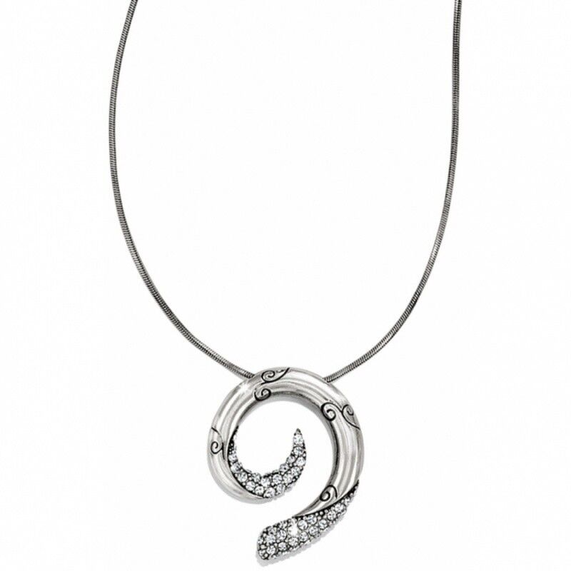Necklace is a woven link design measuring 19" adjustable with a lobster claw clasp closure and bead adjustment feature and features a swirl shaped pendant measuring 1 1/4" and is 1" wide with etched detailing and encrusted with Swarovski crystals.