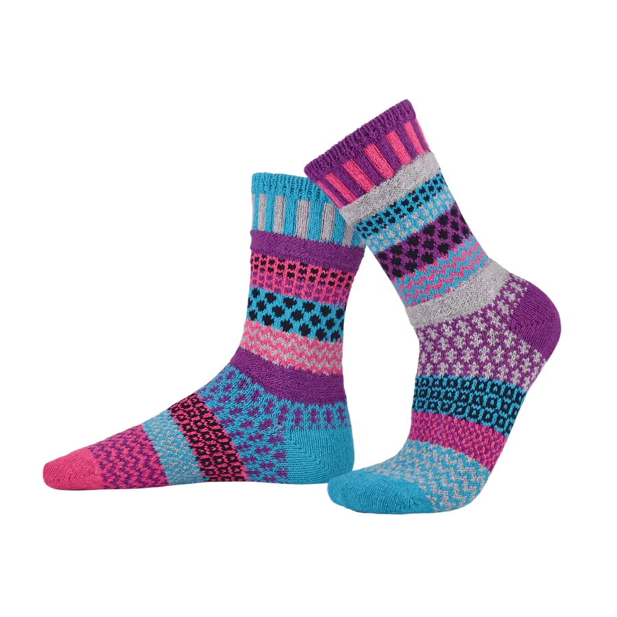 Embrace the lively spirit of spring with our Periwinkle Crew Socks, inspired by the diverse colors of periwinkle. Featuring a playful blend of Pacific Blue, Purple, Light Grey, Magenta Pink, and Black, these socks add a vibrant touch to your wardrobe, making every wear a celebration of the season's joy.